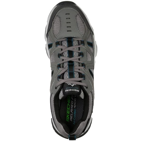 Keep balanced and forge ahead on any terrain with the SKECHERS Relaxed Fit: Crossbar shoe. Smooth leather, synthetic and mesh fabric upper in a lace up athletic sporty comfort trail walking and hiking sneaker with stitching and overlay accents. Air Cooled Memory Foam insole, comfort all terrain outsole.