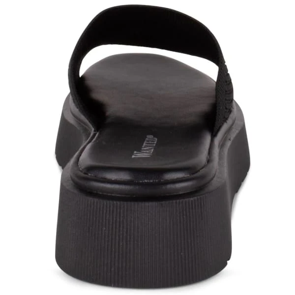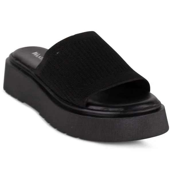 - Platform slide sandal with stretch knit upper.
